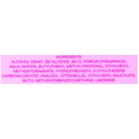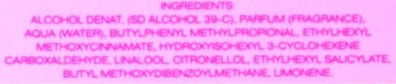 Alcohol Denat., Fragrance (Parfum), Water\Aqua\Eau, Geraniol, Linalool, Benzyl Benzoate, Citral, Benzyl Cinnamate, Eugenol, Alpha-Isomethyl Ionone, Citronellol, Limonene, Benzyl Alcohol, Ethylhexyl Methoxycinnamate, Butyl Methoxydibenzoylmethane, Ethylhexyl Salicylate, Ext. Violet 2 (Ci 60730), Red 33 (Ci 17200), Yellow 5 (Ci 19140)